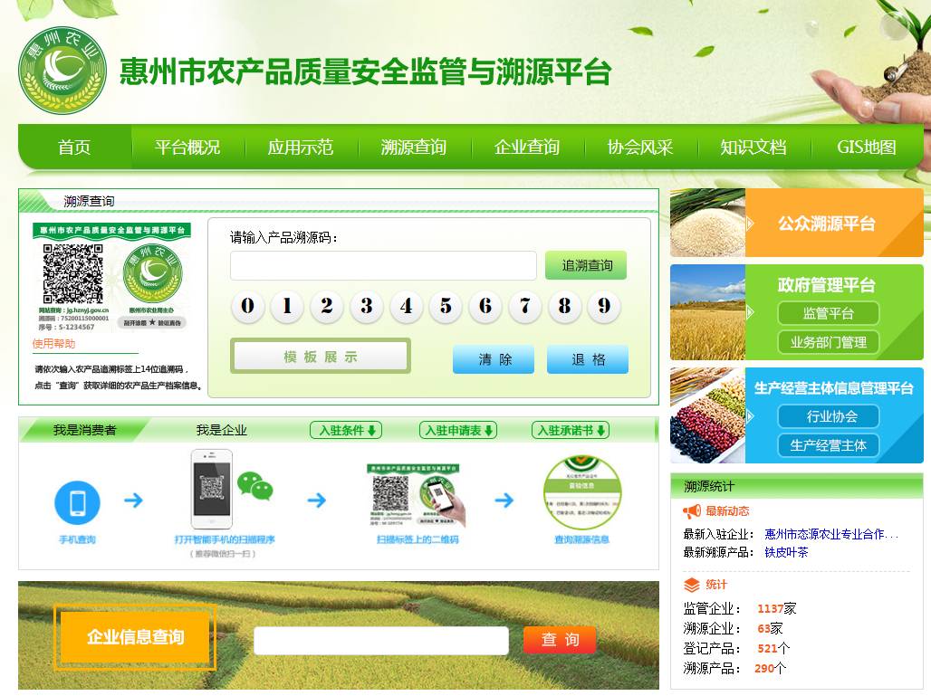 惠州市农产品质量安全监管与溯源平台网站页面